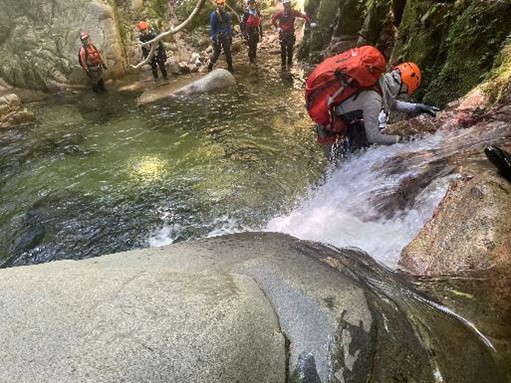 F5は難しい滝のため、迂回ルートを利用することになりました。迂回ルートにロープを張っていただき、右への移動は初めで少し怖かったですが、お助けロープや声かけに助けられ、安全に通過することができました。