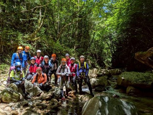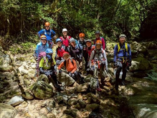 入渓地点は林道から約15m程度下り入渓。天候続きで水量は少なく川幅も広いし、明るい。泳ぎたい人は泳ぎ滝を登るし、泳ぎたくない人はヘツリ滝を登る。滝は2m程度の高さで難しくはない。F5は登れない為、高巻となる。安全の為、フィックスロープを張り全員無事通過する。今回の難所はF5である。泳ぐ距離は短く、水は綺麗で流木はほとんどなかった。