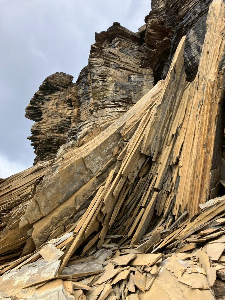 我々B隊も食事を済ませ、荷物を持ち出発する。小屋は岩棚の上に位置しており、一旦下降して平坦なガレ場を進みアルバータに向かうのだが、歩きやすいルート取りをしたいが難しい。A隊か、過去の登山者のケルンが時々見つかるので我々も途中にケルンを作りながら忠実に辿る。