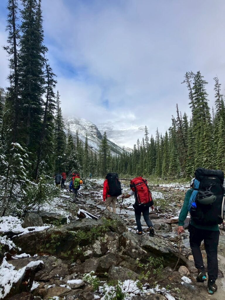 とはいえ、青空は広がっているし進むことにする。今からなんといっても今日の核心、アサバスカ川を渡渉するからだ。氷河が溶け出す川を渡るなんて、人生でするとは思わなかった。皆それぞれの渡渉アイテムを持参した。沢足袋、ランニングシューズ、ビーサン+スリング…? 谷さん安食さん曰く、氷河の氷が溶け出すのは太陽が出てからなので、早朝の方が良いとの事。確かに、みんなで渡ったからそこまでと感じたのか?冷たいけど、出来ないほどではなかった。人に、装備によるが。