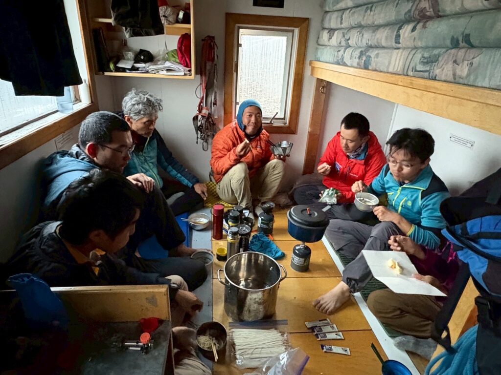歩いて下山したメンバーも少し前にハットに到着したらしく、中田くんが大量に作ってくれた水で皆でラーメンを作り、たらふく食べた。