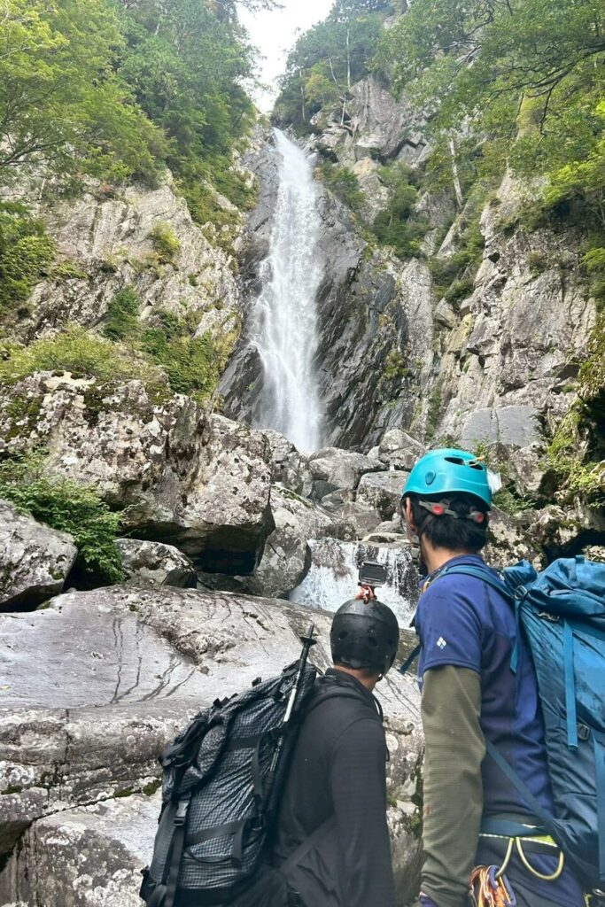 メンバーの疲労もたまってきたころに、それまでのものとは格段に違う、ものすごい迫力の滝が見えてきた。ご来光の滝だ。近づくと、見た目の迫力に加え、滝から吹き付ける風もすごく、一瞬疲れが吹き飛び、みな滝に見入る。