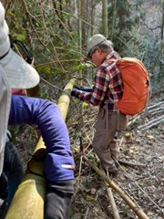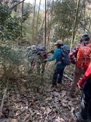 昼食は八世以山でとったが、風が強く寒かったので30分ほどで出発した。登山道は踏み跡もしっかりしており迷うことはないが、八世以山からの下りで、幾重にも竹が倒れて道を塞いでいるところがあった。また竹の枝葉が茂り通りにくくなっていたので、用意していたハサミ・ノコギリを使用して道を確保した。この整備作業は参加者に好評だった。
