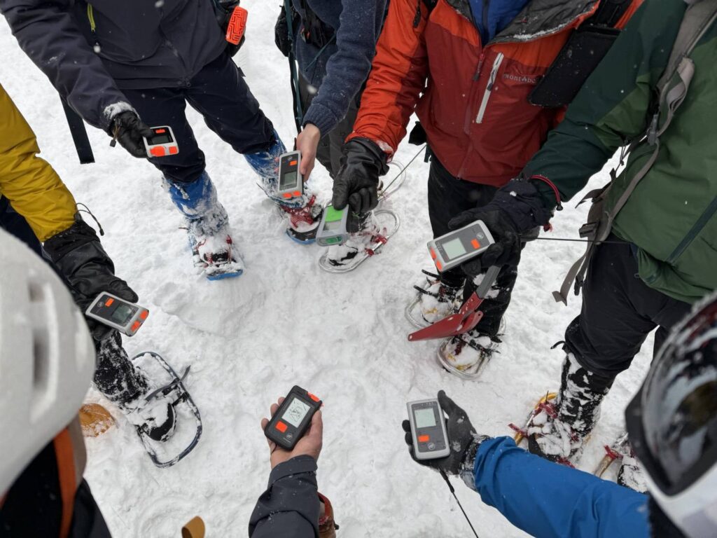 その後、コンパニオンレスキュートレーニングを行いました。ビーコンのSENDモード自動復帰機能や近接複数埋没により捜索が乱れるシーンもありましたが、最初は戸惑っていた参加者も、繰り返すうちに動きが機敏になり、チームワークも目に見えて向上していきました。