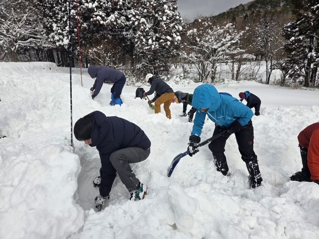 ビーコンのグループチェック、プロービング、シャベリング、エアポートアプローチといった基礎を学んだ上で、実践のコンパニオンレスキュートレーニングを行った。生存確率の高い10分以内に埋没者を見つけ救出するために、参加者は走りにくい新雪の上を必死に走り、大きな声で仲間とコミュニケーションを取り、スコップで雪崩埋没者を掘り出す。いかに短時間で救助するか、みんなの気迫と動きは素晴らしかった。こういう支部の仲間と雪山に行くのは心強いと感じた。