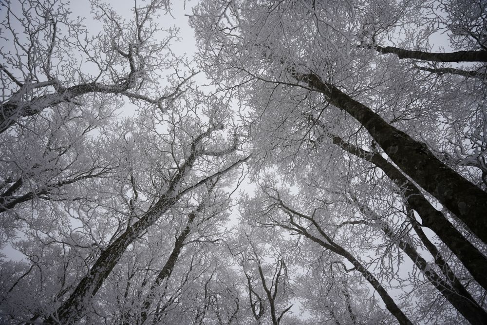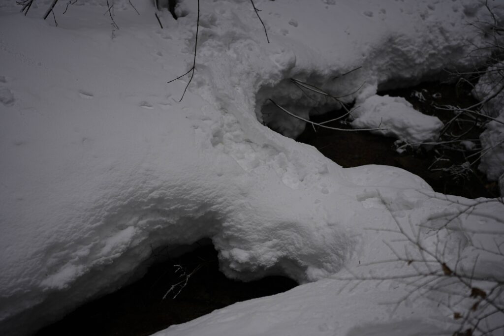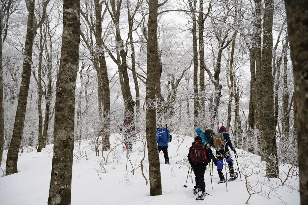 当初は、伯耆大山山域の烏ヶ山と皆ヶ山を登る予定であったが、大寒波が到来した為、急遽、比婆山の日帰り山行に変更した。行きの道中、予想していたよりは降雪がなく山肌も地面が見えていたため、雪がないと心配していたが、いざ山に入ってみると、まあまあ残っていたので安心した。また幸いにもトレースもなかったので、なるべく初心者の方に先頭を歩いてもらった。途中、沢に落ちない様にスノーブリッジを渡る。途中地図と実際の地形を照らし合わせながら進んでもらった。地形が複雑で地図と照らし合わせることに苦戦したが、無事に越原越に到着した。ここからの稜線はブナ樹林に雪が積もった美しい景色が広がり何度来ても飽きない。途中、出雲峠の避難小屋で、昼食を食べた。ここの避難小屋に初めて入ったが、中央で焚火が可能との事。