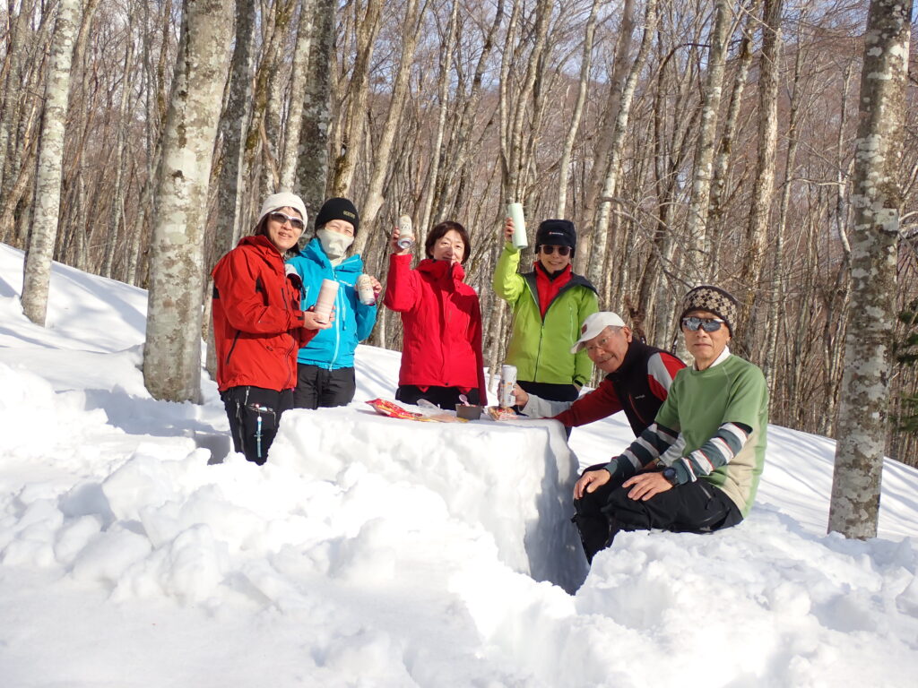 雪でテーブルを作った2人が、乾杯したあとに「2月の風はまだ寒いのう!」と言って、即、テントに撤収したのには笑ってしまった。同じく雪で作った和式トイレが使いやすかった。いままで手際のいいメンバーに先を越されて作る機会がなかったので、次回の雪山山行では自分でも制作してみたい。