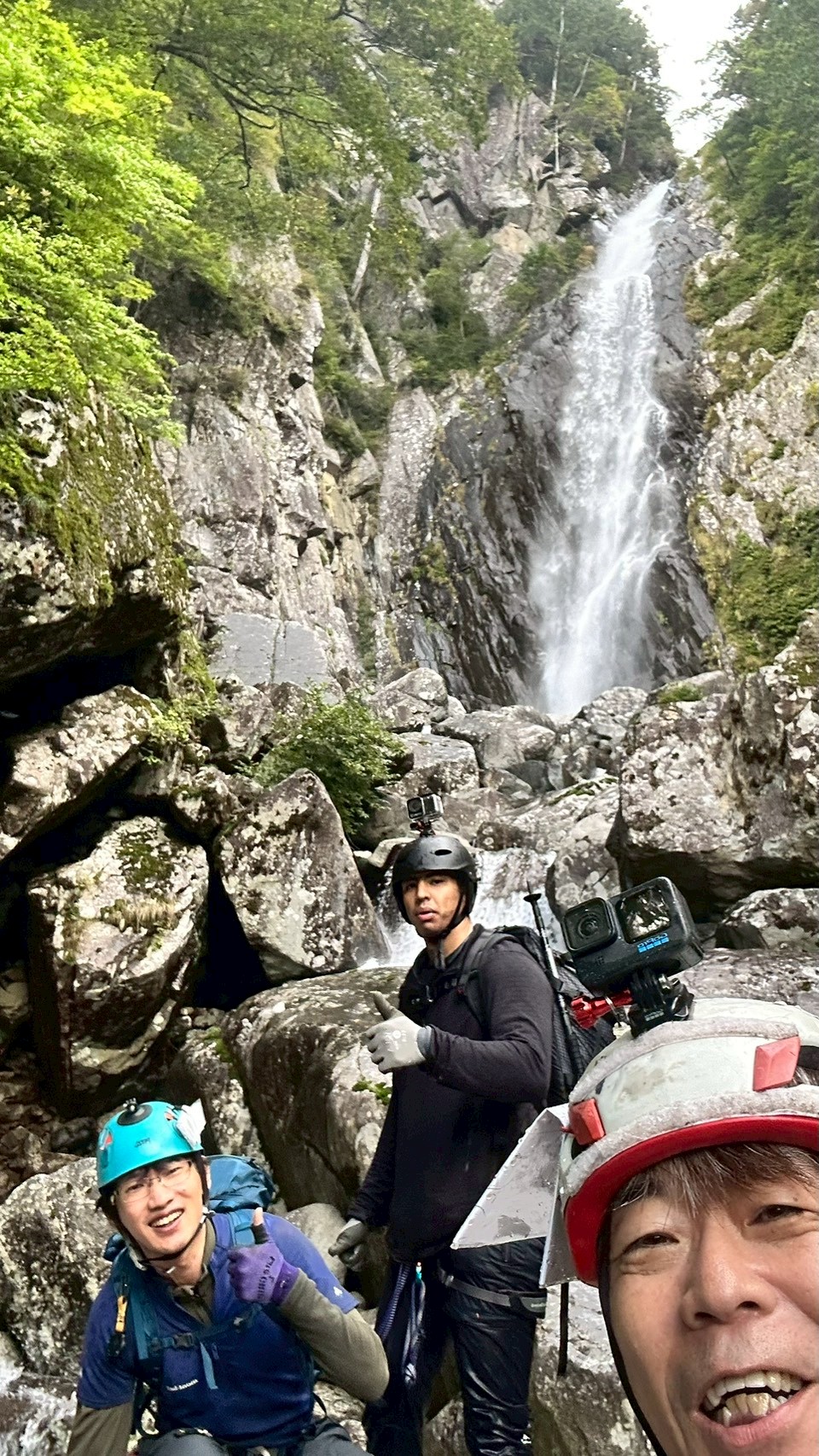 大きな淵は岩にへばりついたり、泳いだりしながら滝のそばまで行きました。途中、コケで手が滑ったり、滝の流れで前に進めなかったりと苦戦することもありましたが、最後まで楽しい沢登りでした。