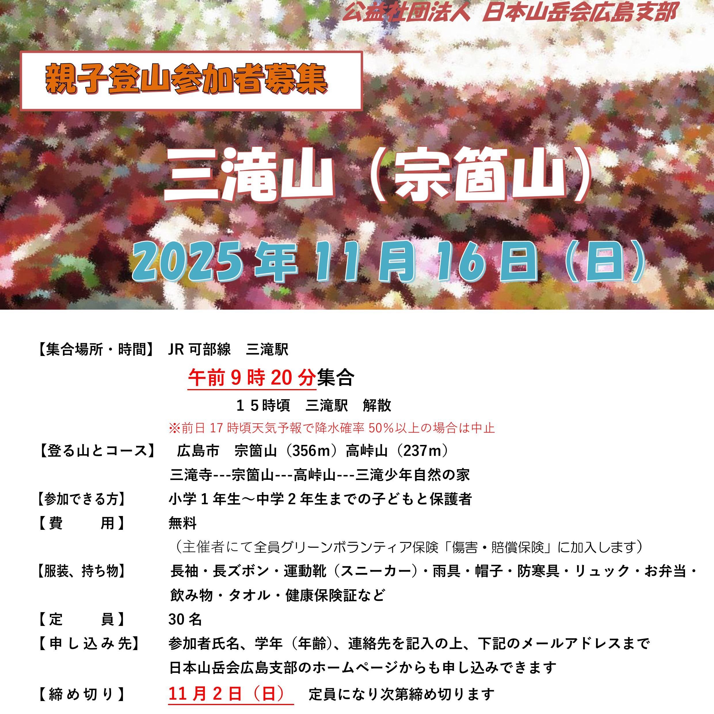 親子登山参加者募集(11月三滝山)